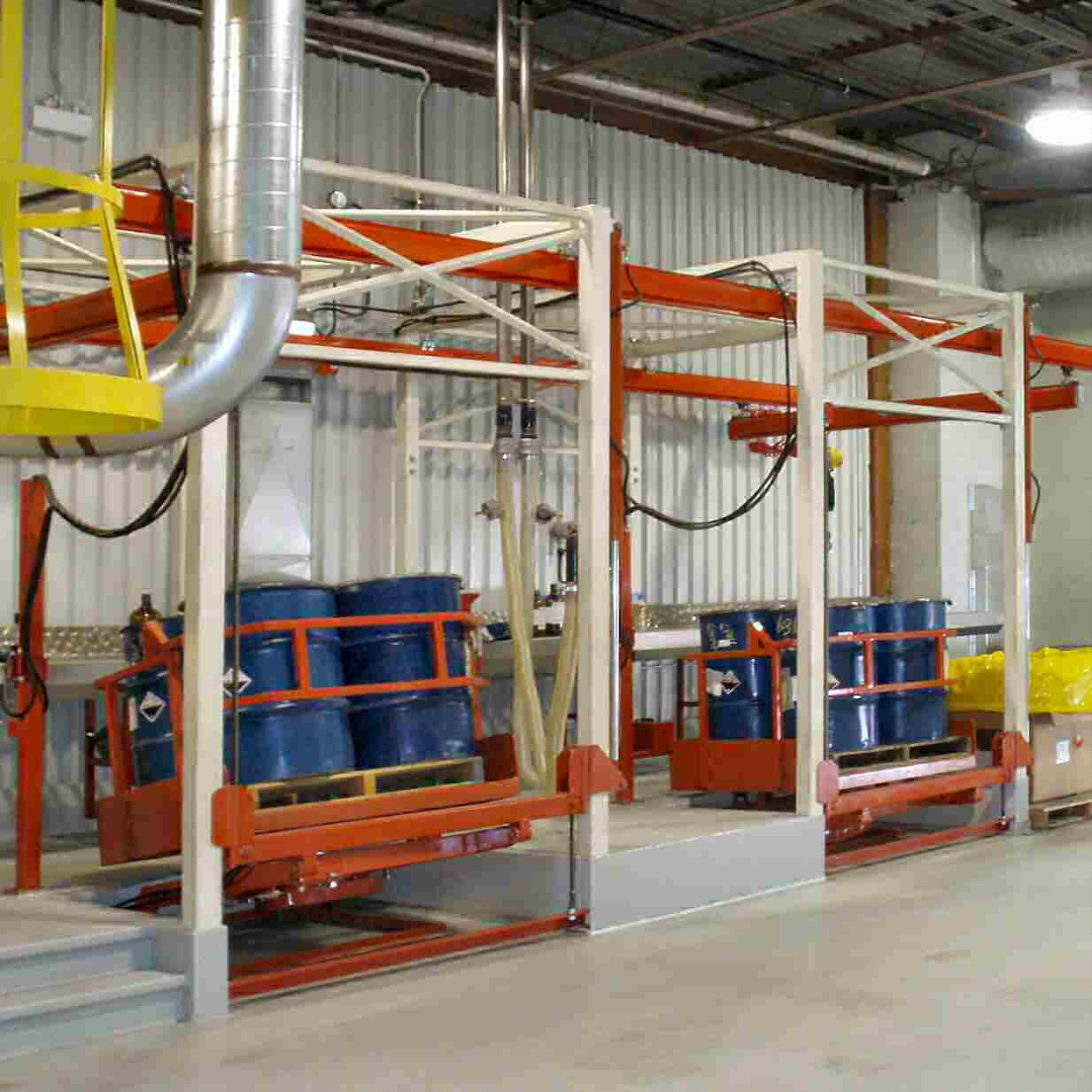 Drum Handling EquipmentCertain processes require special Drum Handling Equipment. Transdynamics provides custom designed solutions including ergonomic Drum Unpacking Stations; Drum Deheaders for quick removal of closed-top drum lids; Drum Manipulators for XYZ translation and rotation; Drum Tippers for controlled pouring of reactive materials; Battery powered Drum Stackers for stacking drums inside transport trailers and shipping containers. We also design and build gravity and powered roller conveyors for drum handling. |